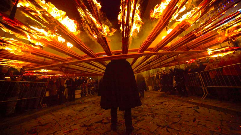 Traditionally, the N’doccia has the shape of a fan or an aura and is made of fir. It is composed of multiple torches that range from two to twenty and it’s carried by a group of men, dressed as farmers. If the N’doccia is too big because it has too many torches, it requires more than one man.