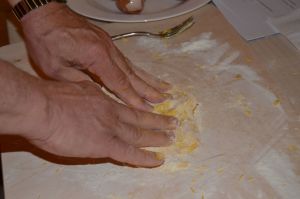 1. Pour the flour on a pastry board, begin to add a bit of water in the central cavity and knead a little flour at a time, continue to pour water and add flour until the dough is smooth and workable.