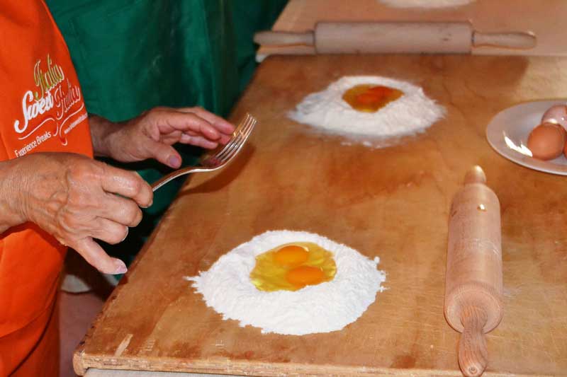 1. Heap the flour, and make a well in it. Break the eggs into the well. Beat eggs with a fork. Stir into the flour from the bottom of the well with the fork until the dough in the center is smooth.