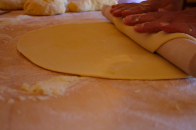 3. Roll the dough out very thin with the “mattarello” (rolling pin) on a lightly floured surface. Alternatively, if you have a pasta machine, follow the manufacturer’s instructions for rolling out the dough into sheets about 1 millimeter thick.