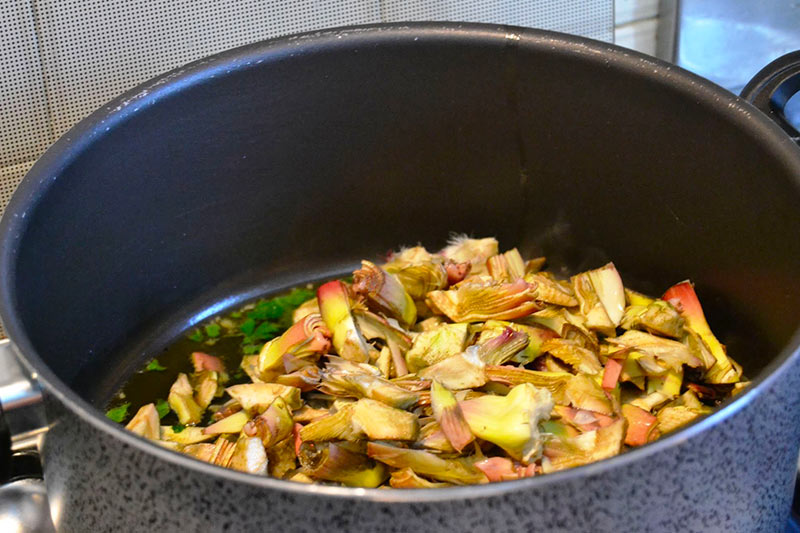 3. Cook for about ten minutes, adding water to obtain some creamy parts of artichokes.