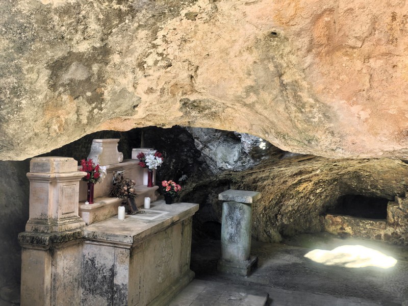 Inside, you’ll find a plastered cistern, basins for rainwater, and an altar from 1884.