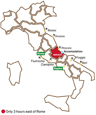 Abruzzo’s international airport is located at Pescara, 70km away from us, and if you are also wondering where Pescara is located…well, it is just approximately one hour flight from Milan! 2 hours from Bruxelles, 3 hours and a half from London…