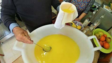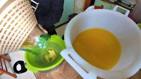 2. Insert the lemon peel into a tightly sealed glass jar and infuse in pure alcohol for 10-12 days in a cool place away from light and stirring it once a day. Mamma Anna Maria and Papà Angelo, made a lot of Limoncello (32 lemons) so they used a big bowl:-)
