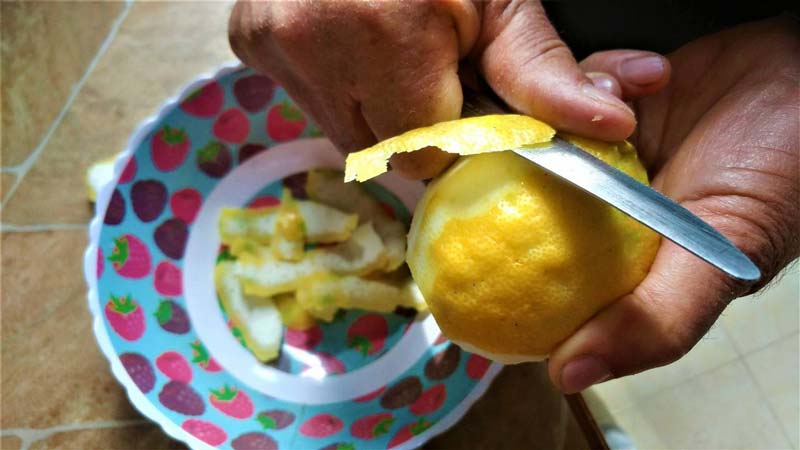 1. Wash the lemons well with a metallic sponge, dry them and peel them with a potato peeler or a knife (Papà Angelo’s favorite method). Remove only the yellow part and leave the white and spongy one on the lemon, as it could give the liqueur a bitter taste