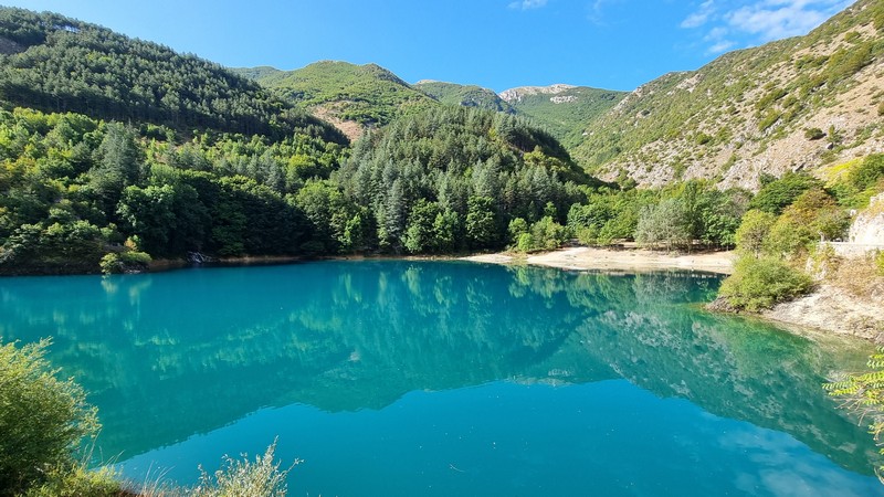 The lake of San Domenico, with its clear, green waters fed by the Sagittario River and small waterfalls, is perfect for swimming, boating, and windsurfing.