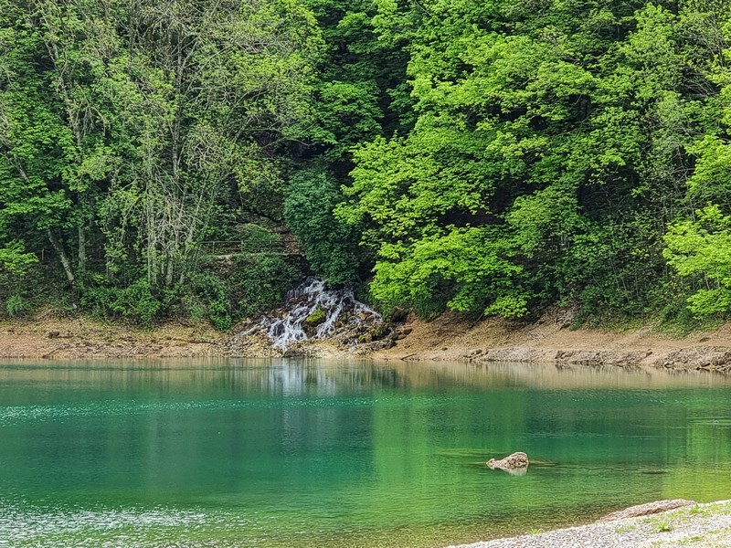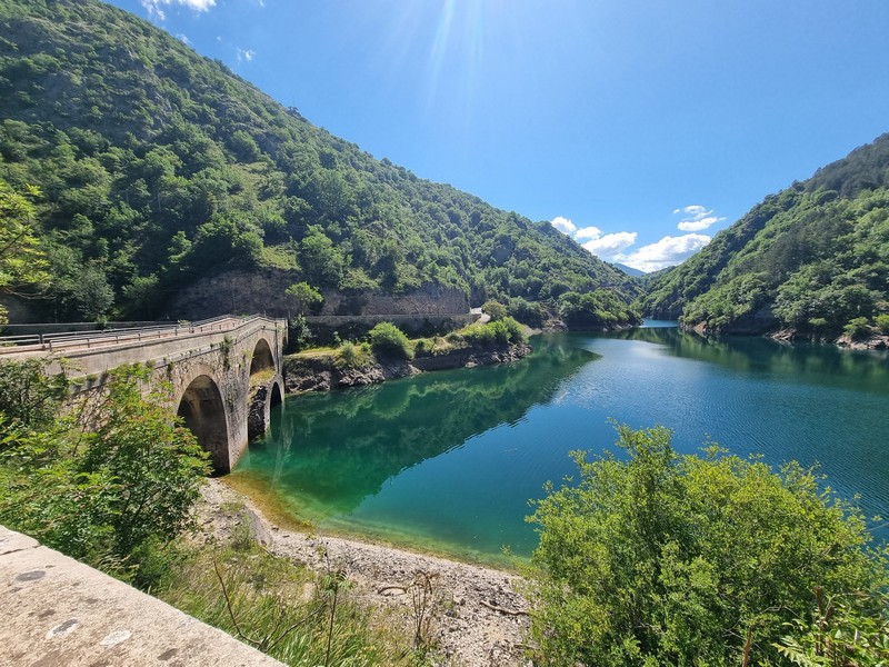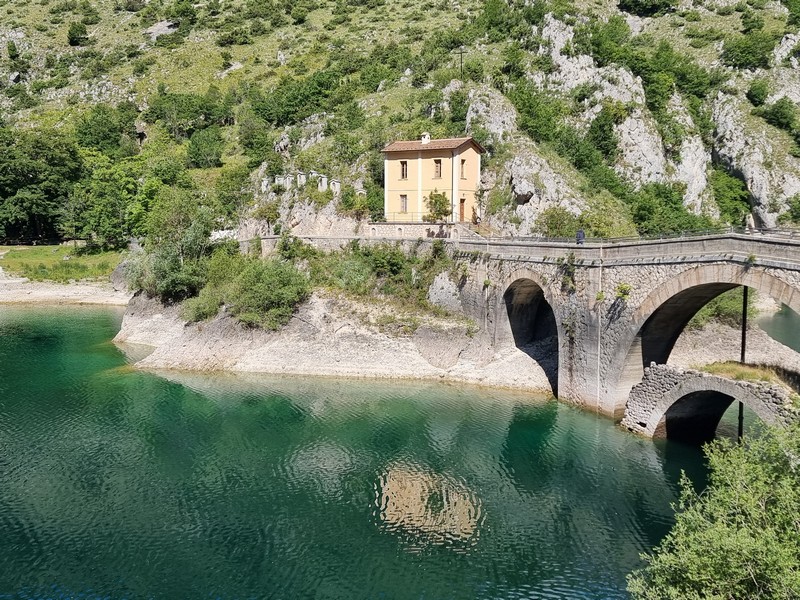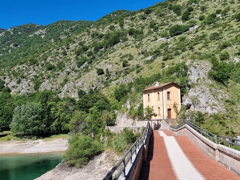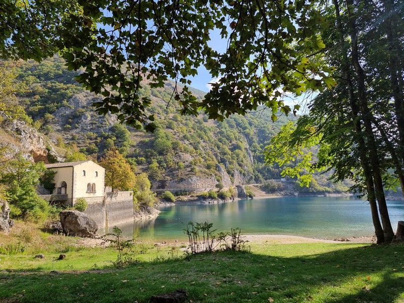 The lake of San Domenico, with its clear, green waters fed by the Sagittario River and small waterfalls, is perfect for swimming, boating, and windsurfing.