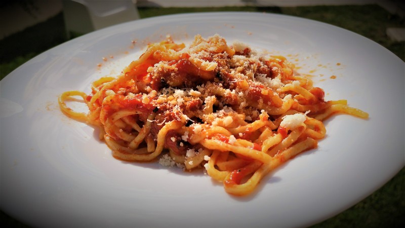 • An example menu based on Fabrizio’s family recipes, includes Bread with meat sauce, Pasta alla chitarra with meat sauce, polpette (meatballs),  and Tarallucci (typical biscuits from Abruzzo)