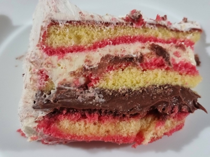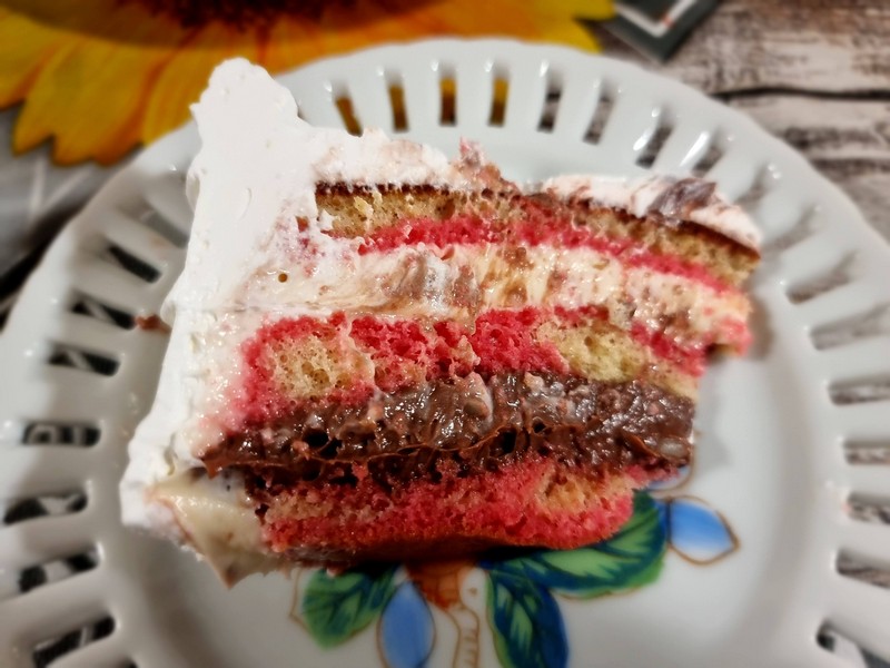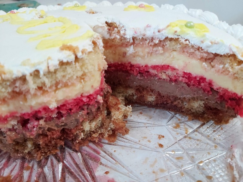 Finally, the top layer is covered with a white glaze made from egg whites, butter, and powdered sugar, or whipped cream, and decorated with colored sprinkles or almond granules.