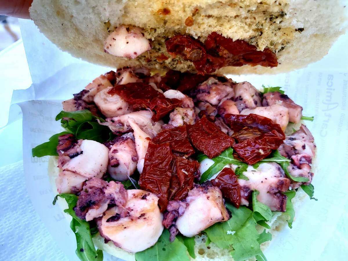 • Panino con polipo (Octopus sandwich): another popular street food in the region, we usually taste it during our tour when we visit the little fishing port of Trani.